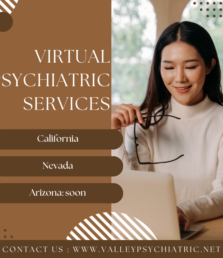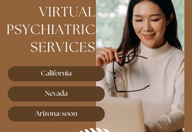 Welcome to our virtual psychiatric office, proudly serving California, Nevada, and soon Arizona! With our secure technology, you can access high-quality mental health care from the comfort of your home. Your well-being is our priority, wherever you are.